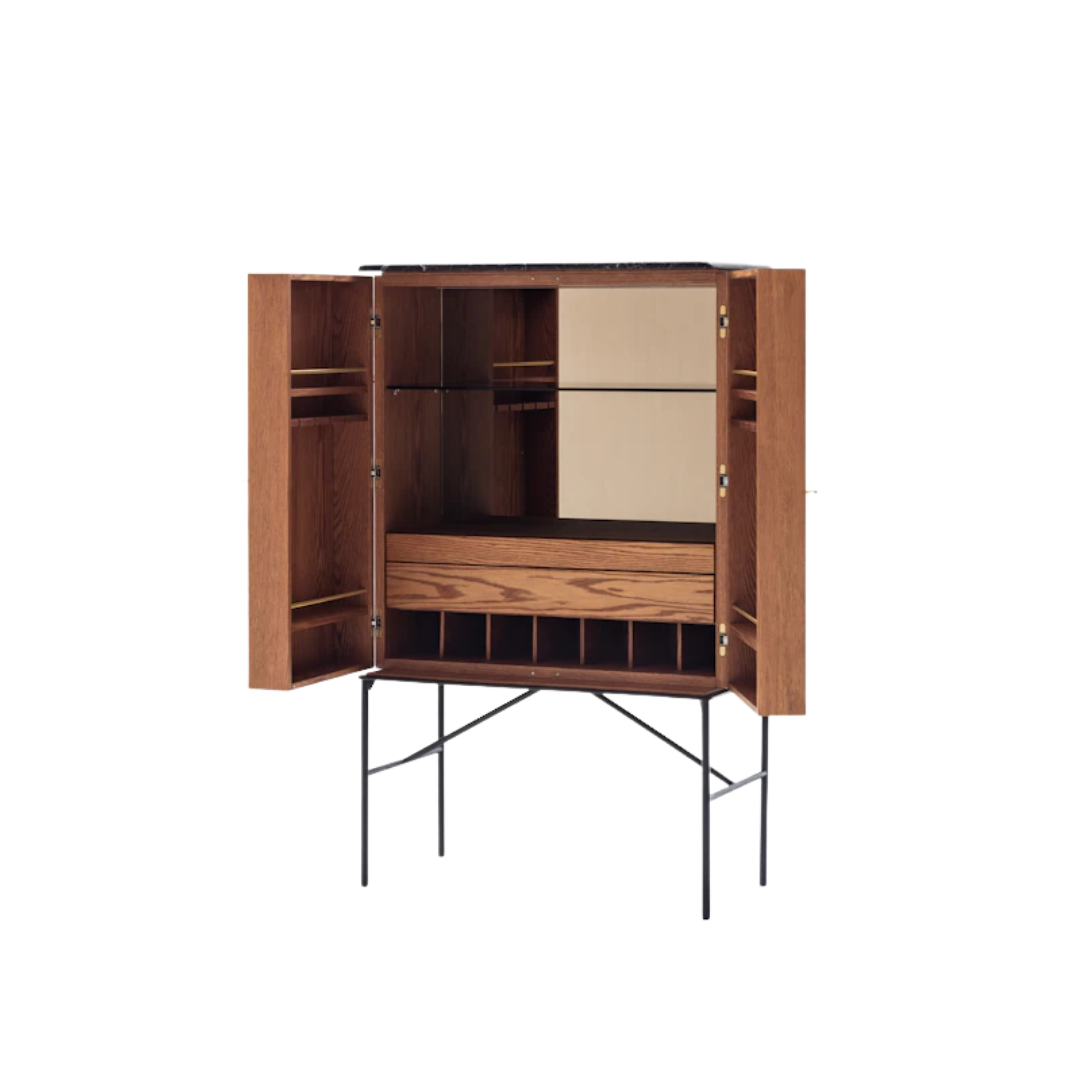 Estrutura: Madeira certificada Acabamento: Iluminação interna Base: Aço Detalhe: Espaços de armazenagem, local específico para copos Design: Leveza, praticidade, organização