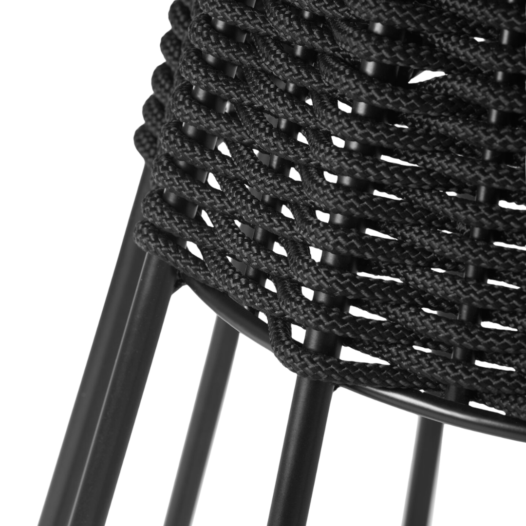 A mesa de jantar Amena tem formato circular e estrutura em alumínio com pintura eletrostática. O acabamento em corda náutica envolve parte da base, acrescentando um ar casual ao desenho. Versátil, adapta-se bem a varandas, áreas de lazer e salas de jantar com proposta mais despojada.