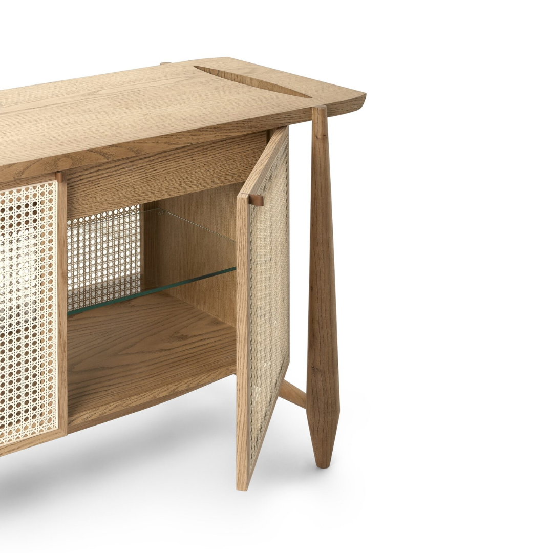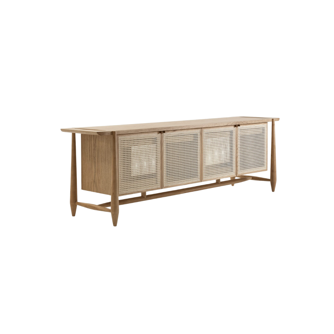A estética do movimento Branco & Preto ganhou um olhar contemporâneo pelas designers da Plataforma4, que estudaram em profundidade suas técnicas, materiais e linguagem para criar o buffet Aero. A peça combina uma estrutura delgada em madeira maciça torneada, sistema construtivo aparente, volume principal suspenso e fechamento em palhinha, garantindo leveza. Um móvel atemporal, brasileiro e de presença marcante, ideal para quem valoriza qualidade e design singular.