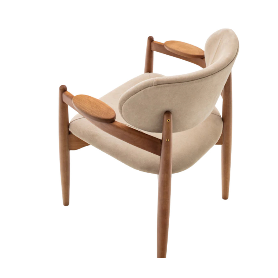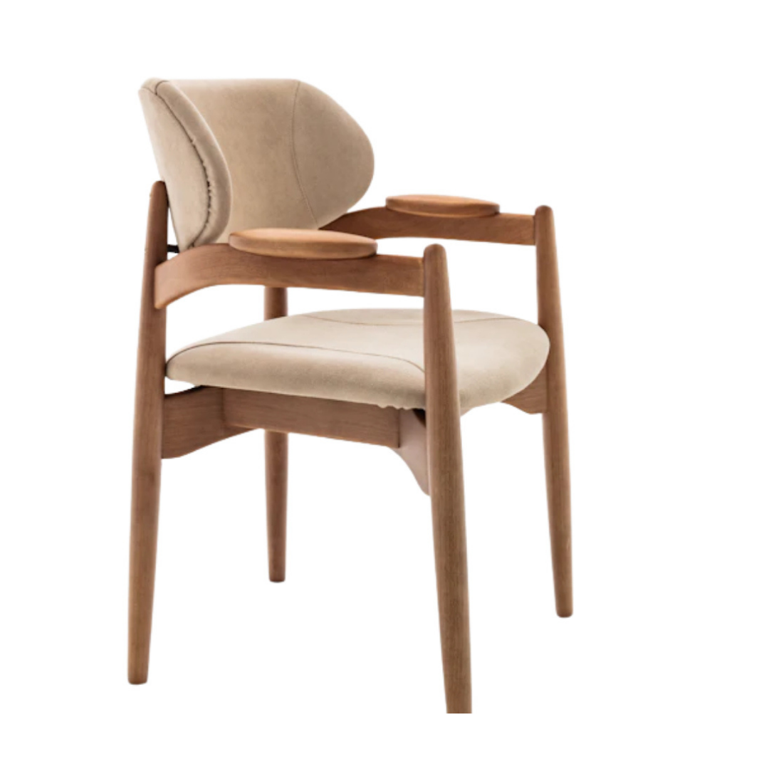 Estrutura: Madeira certificada Acabamento: Latão maciço Tapeçaria: Couro natural ou tecido Assento: Curvo estofado Encosto: Curvo estofado Detalhe: Disponível nas versões com e sem braço Design: Ergonômico, moderno, funcional