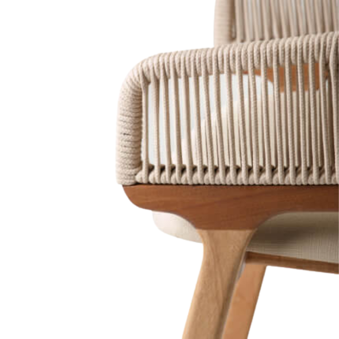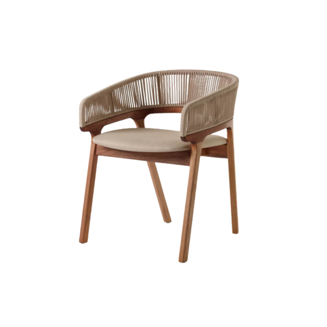 Madeira e corda se misturam a um design orgânico para dar origem à cadeira Arruda. O encosto feito em corda náutica ganha tubos em suas bordas com acabamento no material, enquanto a estrutura em madeira remete a galhos de árvores. Ideal para ser usada em varandas, áreas de lazer cobertas e até salas de jantar com temática mais descolada.