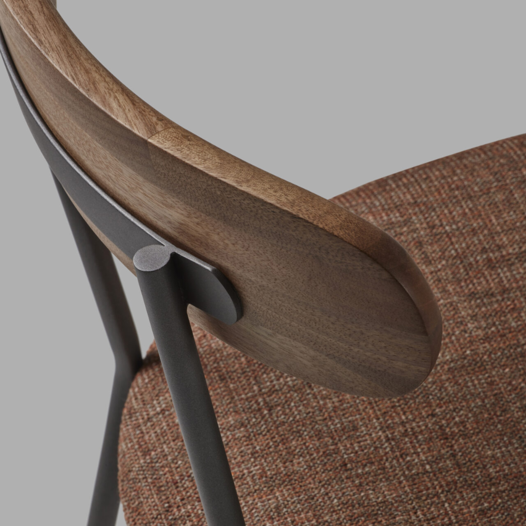 A cadeira Curva tem como diferencial a união de três matérias-primas emblemáticas: madeira, metal e estofamento. No encosto, a madeira passa por prensagem e usinagem que garantem a ergonomia e o conforto da peça, enquanto a estrutura metálica assegura estabilidade e durabilidade. O estofamento completa a proposta ao oferecer aconchego, toque agradável e versatilidade estética, já que a cadeira pode assumir diferentes estilos conforme o tecido escolhido. Ideal para quem gosta de reunir pessoas ao redor da mesa, a Curva funciona perfeitamente em salas de jantar, cozinhas e áreas gourmet.