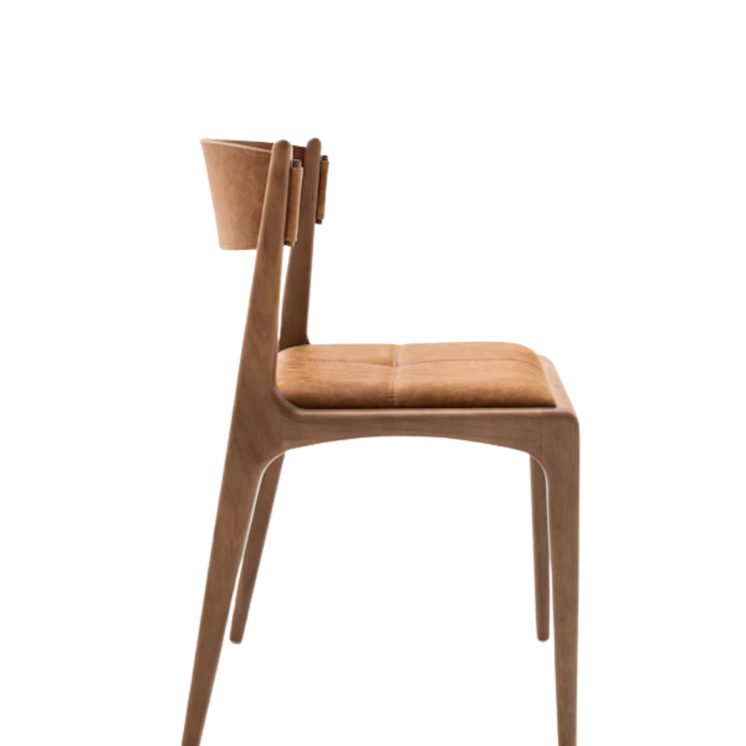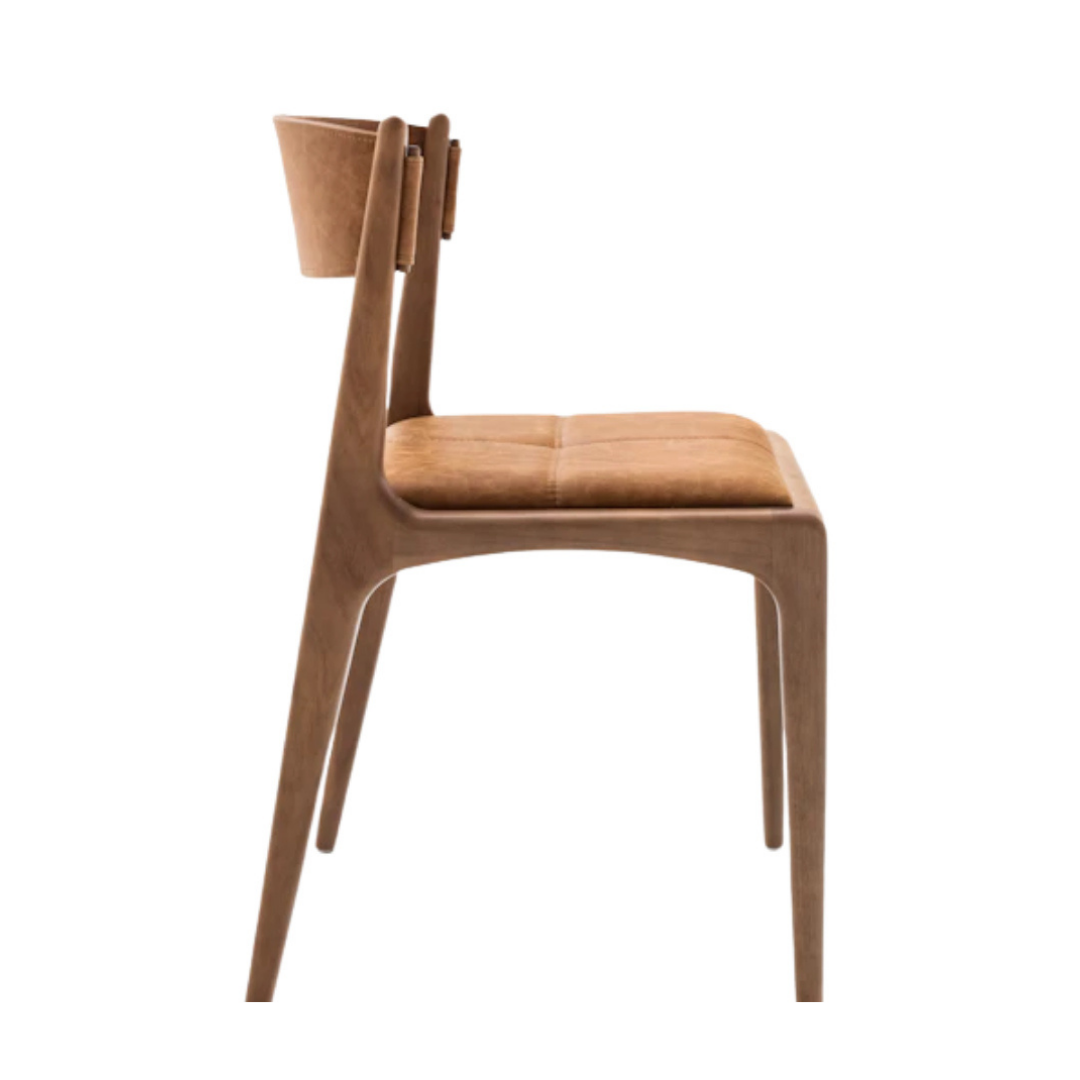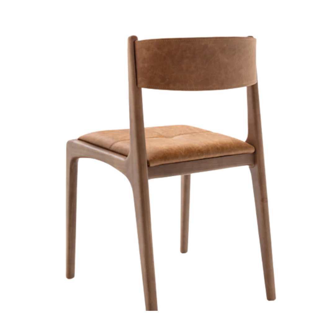 Estrutura: Madeira certificada Acabamento: Acetinado; raiado nas arestas Base: Madeira certificada Tapeçaria: Couro natural ou tecido Assento: Estofado Encosto: Estofado Detalhe: Disponível nas versões com e sem braço Design: Sofisticado, ergonômico e versátil