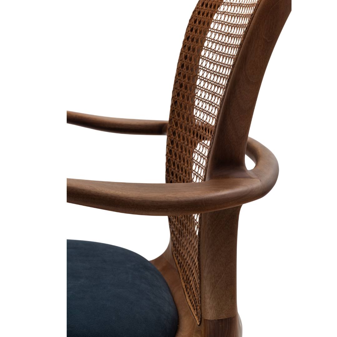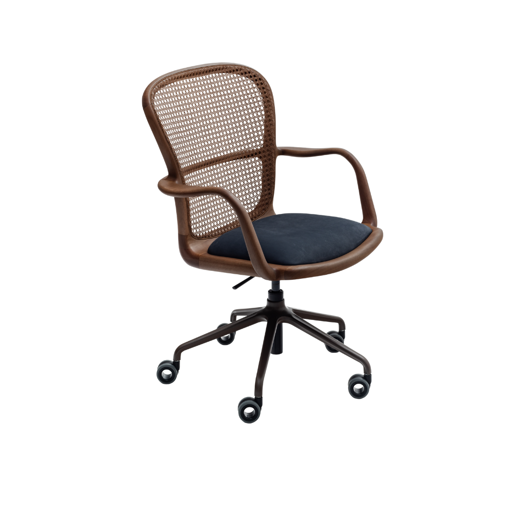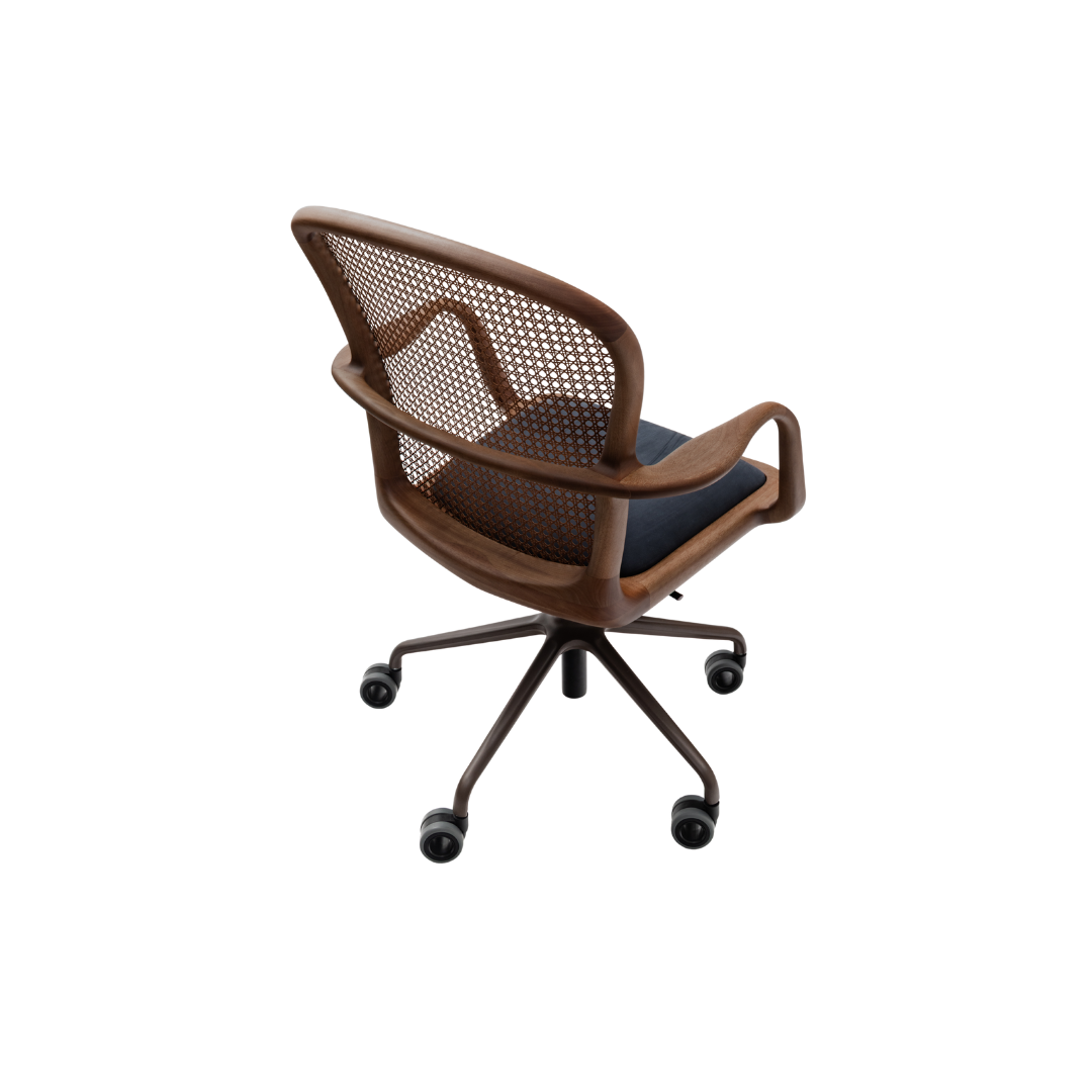 Estrutura: Madeira maciça esculpida em CNC Acabamento: Palha sextavada natural ou estofado em tecido/couro Base: Alumínio injetado com pintura epóxi (três tonalidades) Tapeçaria: Couro natural ou tecido Assento: Estofado (opcional) Encosto: Palha sextavada ou estofado Detalhe: Rodízios com amortecimento inteligente Design: Acolhedor, ergonômico, elegante, funcional