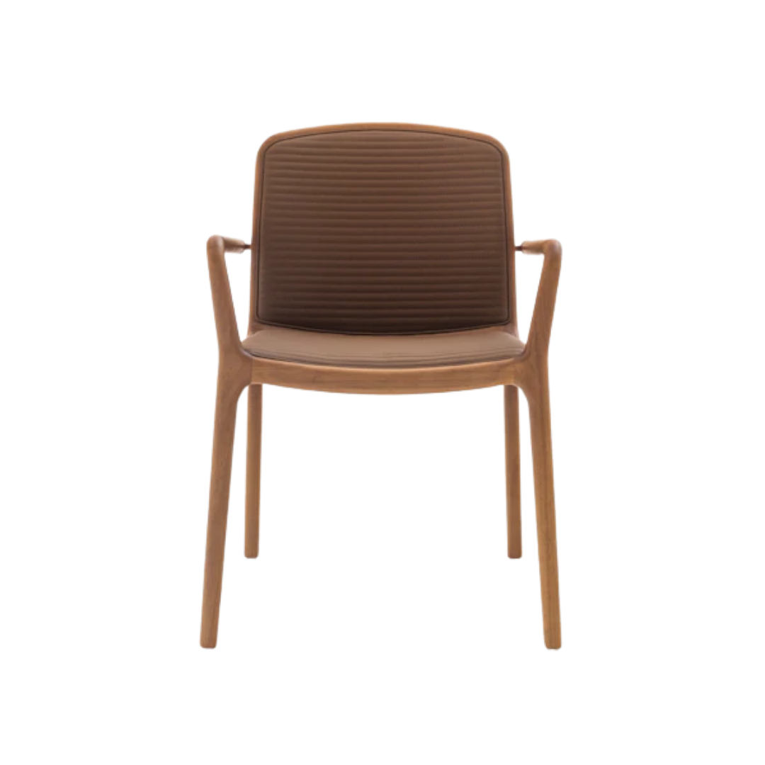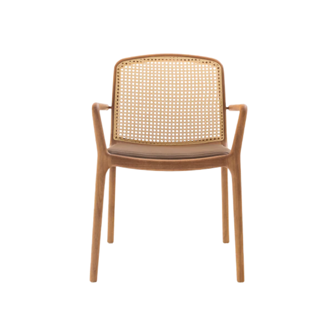 Estrutura: Madeira certificada Acabamento: Opções de palha tramada ou estofado Base: Reforçada em madeira Tapeçaria: Opções em couro e tecidos selecionados Assento: Palha natural ou estofado Encosto: Palha natural ou estofado Detalhe: Disponível nas versões com e sem braço Design: Atemporal, sofisticado, versátil