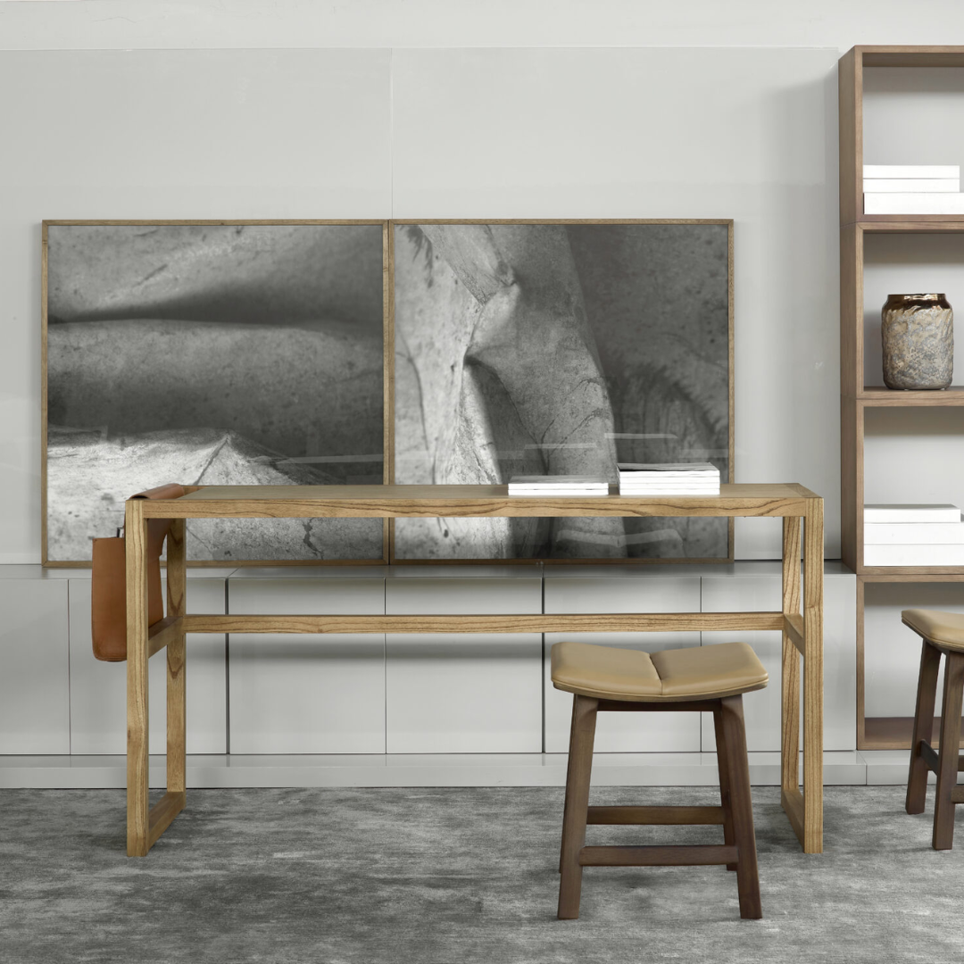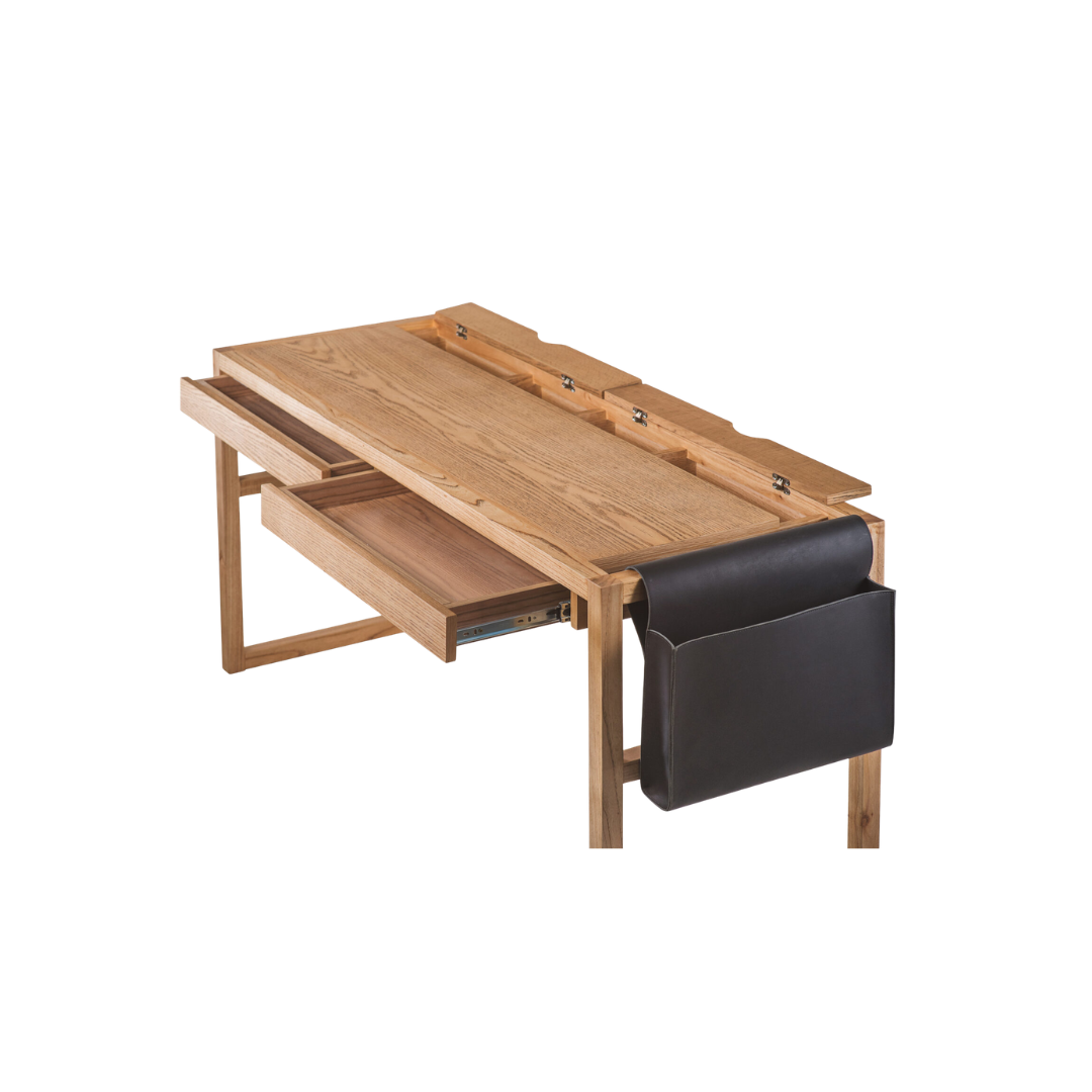 O hábito, não só dos humanos, de carregar coisas junto a si inspirou a Linha Canguru, animal que simboliza essa ideia. Como todos nós, que andamos com bolsas, pastas e mochilas, os móveis dessa família (incluindo banco, mesa lateral, minicômoda e escrivaninha) carregam, literalmente, a proposta. Toda a linha vem acompanhada de bolsas de recouro acopladas à estrutura da peça. A escrivaninha possui nichos em sua superfícies, que pode guardar pequenos objetos como cabos, canetas e blocos de papel. Duas gavetas auxiliam a guardar utensílios maiores e a bolsa de couro lateral é ideal para receber livros, revistas e outros tipos de papel. Ideal para quem não abre mão de um móvel prático e moderno, a escrivaninah Canguru foi premiada no Salão Design 2017.