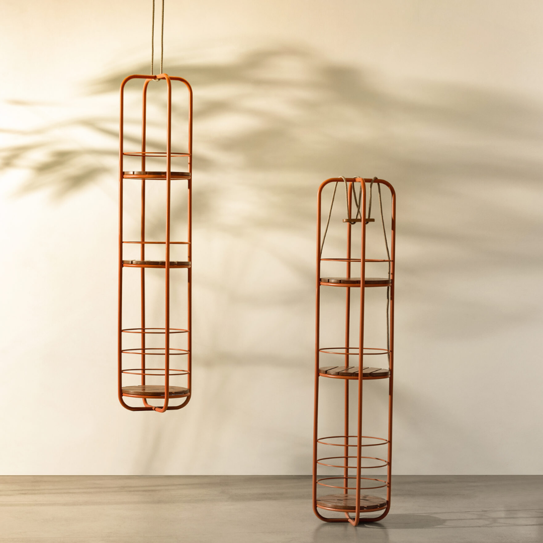 A estante Casulo nasce do desejo de criar uma peça suspensa, compacta e cheia de possibilidades. Ideal para montar um bar ou organizar objetos diversos, seus aros também funcionam como cestos. Inspirada no casulo da natureza, não se apoia no chão, o que amplia as possibilidades de uso, de áreas molhadas e terrenos desnivelados a varandas e ambientes internos, além de facilitar a limpeza. Uma peça assinada, livre e extremamente funcional, produzida em alumínio, madeira e corda náutica e disponível em diferentes cores e acabamentos.
