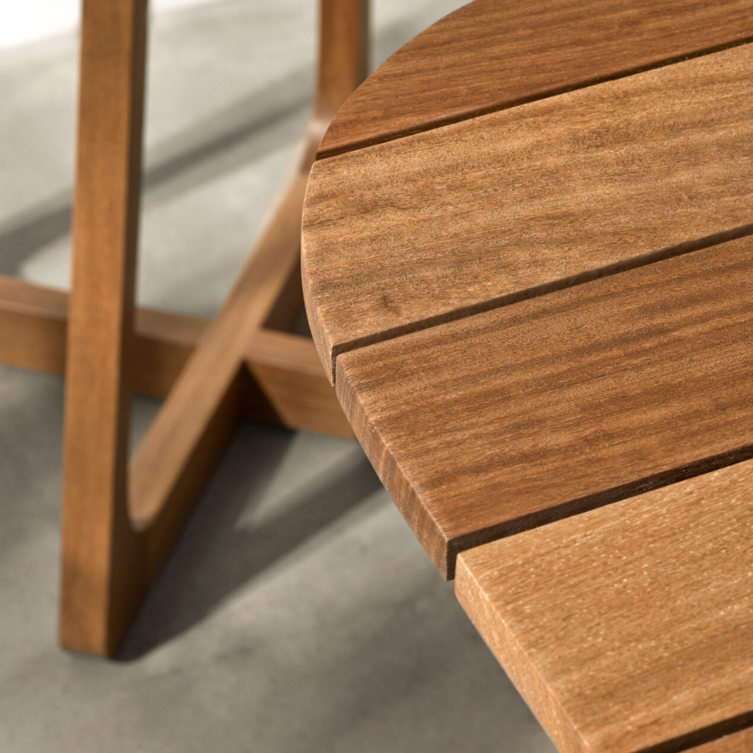 A mesa bistrô Marina integra a linha inspirada na costa brasileira e nas estruturas das embarcações. Seu desenho valoriza formas orgânicas e curvas marcantes, com a madeira maciça como elemento principal. Prática e de fácil manutenção, adapta-se com naturalidade a ambientes de estar e áreas gourmet, reforçando uma proposta de uso descontraída e funcional.