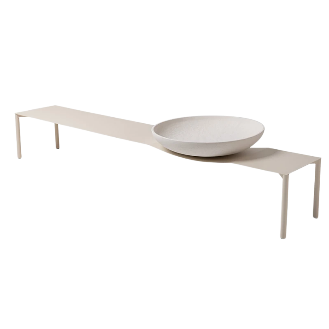 Assim como outros produtos da coleção, A mesa Bowl explora a sensação de movimento em um objeto estático. O bowl de cerâmica parece agir sobre o fino tampo de metal, que é curvado, como se a gravidade fizesse parte do design. Não apenas a forma é reduzida ao mínimo essencial, como ela sugere um ambiente com mais espaço livre, uma vez que o tampo tem a profundidade mínima necessária para apoio de objetos do cotidiano — como copos, pratos e livros. — e o bowl de cerâmica oferece uma solução para objetos que costumam ficar espalhados nas mesas de centro, deixando o ambiente ainda mais limpo e leve.