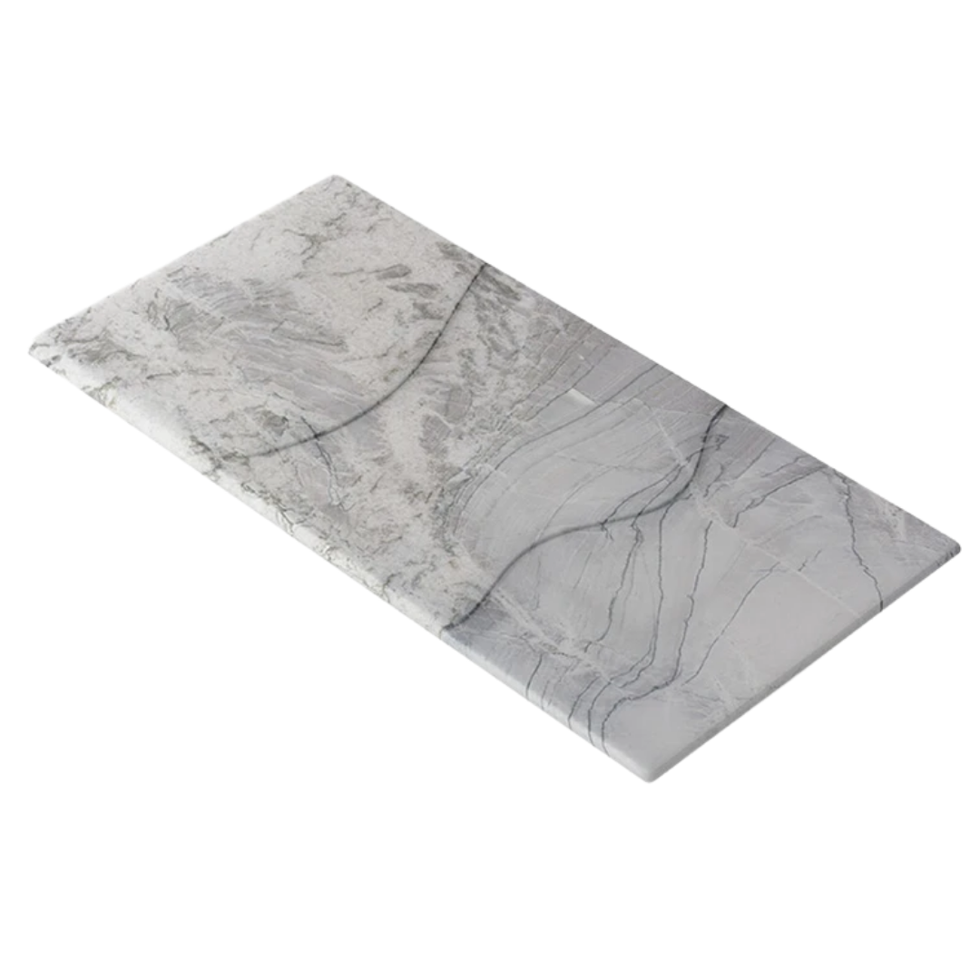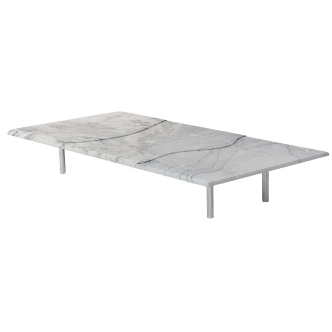 A Mesa Centro Maré retrata um fenômeno de transição das águas. O tampo da mesa é dividido em três partes – e alturas – simulando a chegada ou o recuo das ondas. A base preta gera a noção de profundidade, onde a matéria é densa, complexa e misteriosa, como um oceano noturno. As manchas brancas, em oposição, lembram a espuma da quebra, o devir da onda: água mexida, claridade e atrito. A escolha pela base comprida e retangular contrasta com as formas ondulares, que dão vida às camadas da mesa. O móvel vira uma paisagem para a sala, ou melhor: fotografia de paisagem.