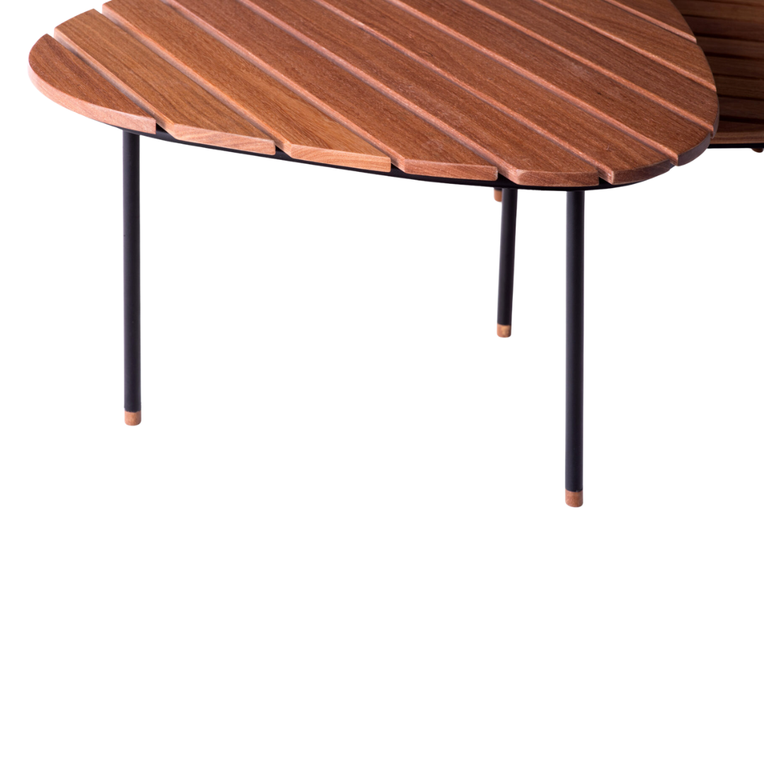 A mesa de centro Fóssil nasce da inspiração em formas naturais fossilizadas, com desenho orgânico e delicado. Disponível em duas medidas de tampo e duas alturas, permite que a versão menor funcione também como mesa lateral. Os três pés em alumínio sustentam o tampo de ripas de madeira de forma quase imperceptível, valorizando a leveza visual da peça e permitindo a passagem da luz. Seu formato favorece a circulação ao redor e possibilita o encaixe de pufes ou cestos, adicionando funcionalidade ao conjunto.