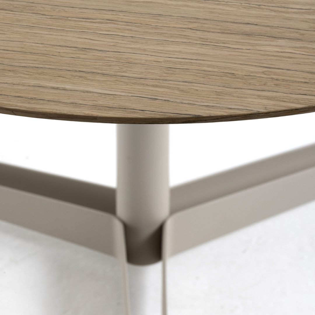 A mesa Videira é inspirada no universo dos vinhos. A árvore e as raízes da videira, árvore frutífera de onde crescem as uvas e se origina o vinho, são representadas pela estrutura da mesa e os três pés em metal. Na ponta de cada pé há um elemento que representa a rolha das garrafas, arrematando o desenho estrutural. O tampo “triangular”, por sua vez, acompanha o movimento dos pés, em um formato arredondado que cria uma referência aos barris onde o suco de uva é fermentado.