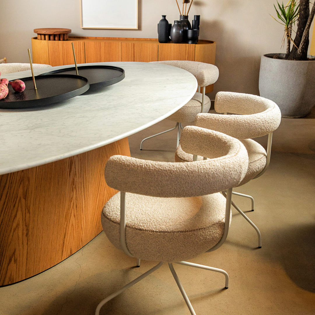 A mesa de jantar Sava Elíptica amplia a linha ao adotar uma forma orgânica que favorece a circulação e oferece mais conforto no uso diário. Seu desenho fluido reforça a leveza visual da peça, ao mesmo tempo em que se adapta bem a espaços compactos. Versátil, pode receber diferentes acabamentos no tampo — como madeira, mármore ou laca — e funciona tanto em salas de jantar quanto em escritórios e ambientes comerciais.