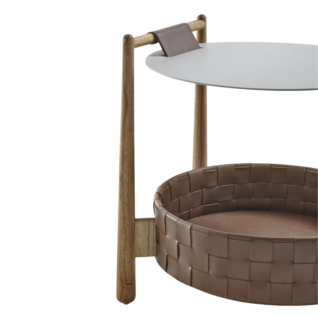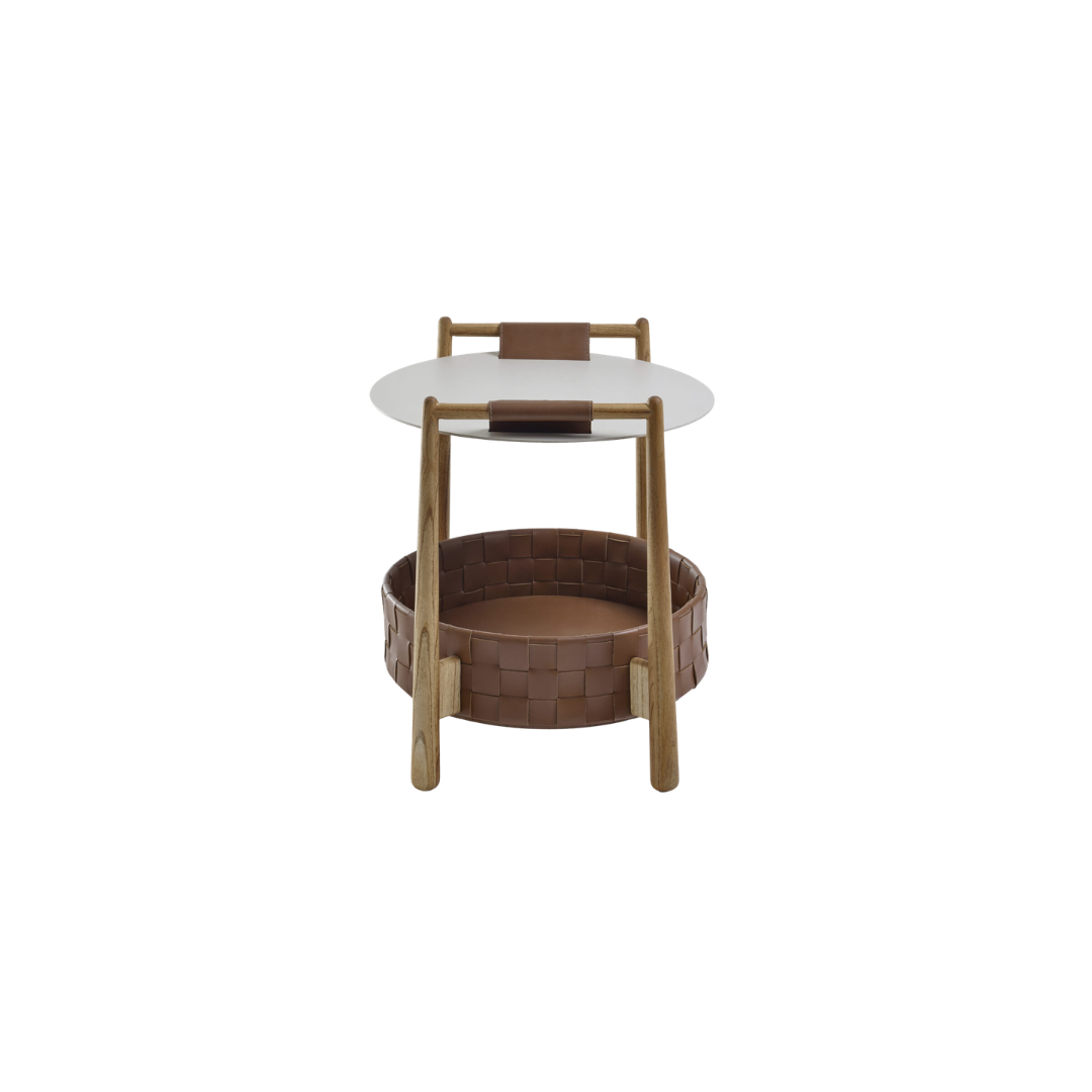 A mesa lateral Laços combina madeira e couro levemente trançado em um desenho que valoriza a brasilidade. O couro aparece tanto na cesta inferior quanto na sustentação do tampo, criando unidade visual e funcional. Versátil, funciona bem em salas de estar, áreas gourmet ou como mesa de cabeceira. Uma peça que equilibra tecnologia e artesania.