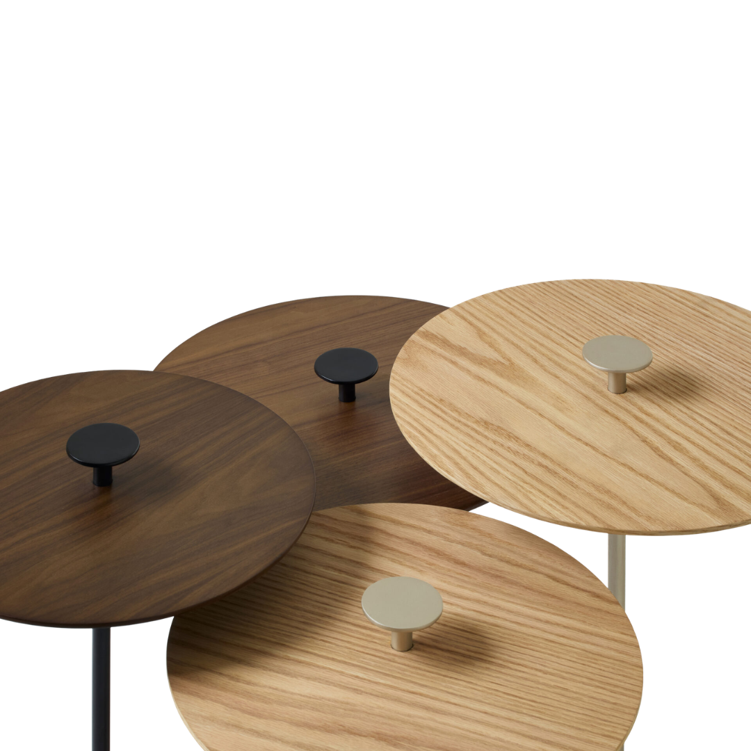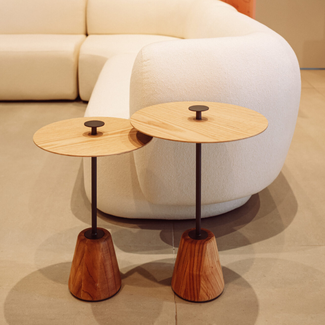 A mesa lateral Pega apresenta base em madeira maciça com bordas suavemente abauladas, revelando uma sofisticação discreta. Seu diferencial está na haste metálica que atravessa o tampo e se transforma em uma pega ergonômica, detalhe que inspira o nome e acrescenta função e apelo tátil à peça. Ideal para salas de estar e home theaters, a Pega simboliza hospitalidade ao oferecer suporte prático para copos e petisqueiras em encontros sociais. Sua versatilidade se amplia com a variedade de tamanhos de tampo e alturas, permitindo composições harmoniosas para diferentes estilos e proporções de ambiente.