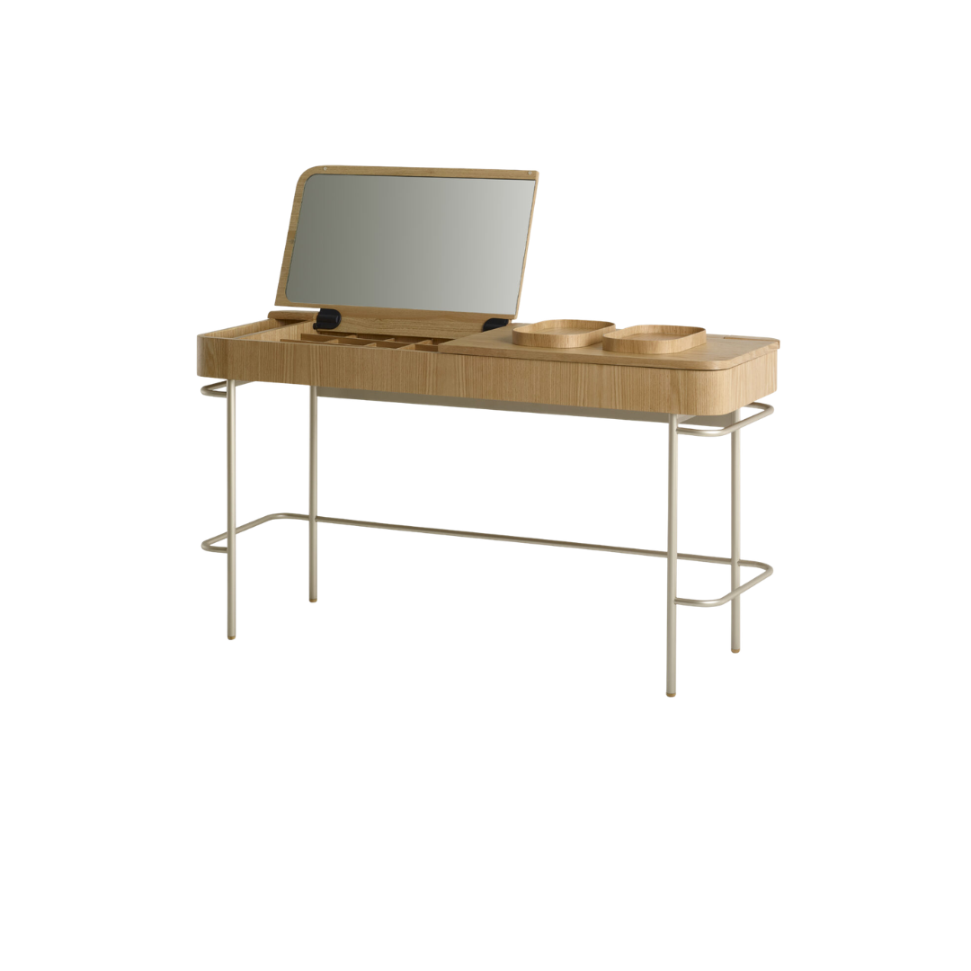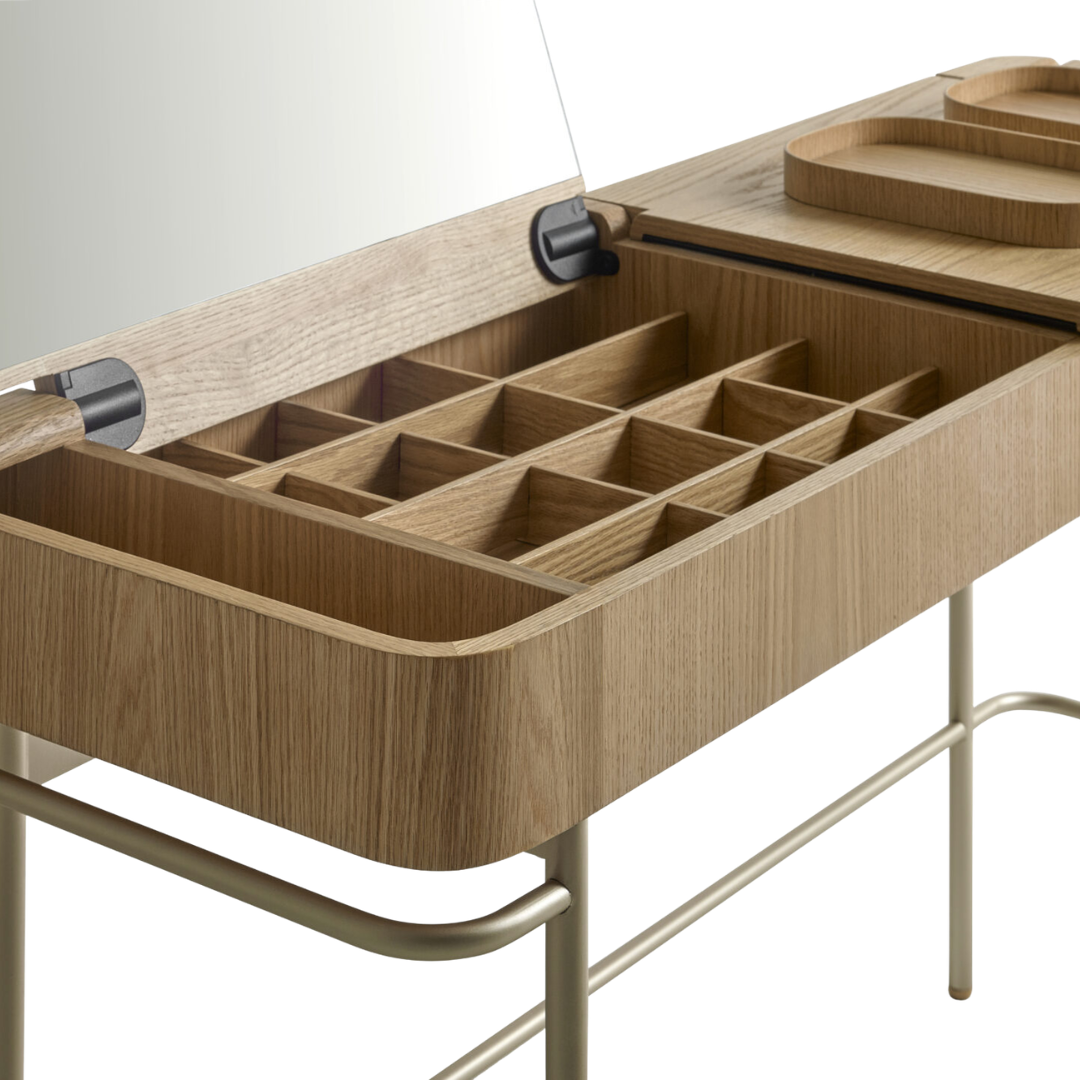 A penteadeira Pandora, inspirada no mito da caixa de Pandora, surpreende pelo tampo que se abre e revela várias divisórias. Sua estrutura de metal sustenta uma caixa em lâmina natural com pontas arredondadas, enquanto a parte interna do tampo traz um espelho articulado com amortecimento. Também disponível na versão escrivaninha, a Pandora é ideal para quem valoriza organização e funcionalidade no dia a dia.