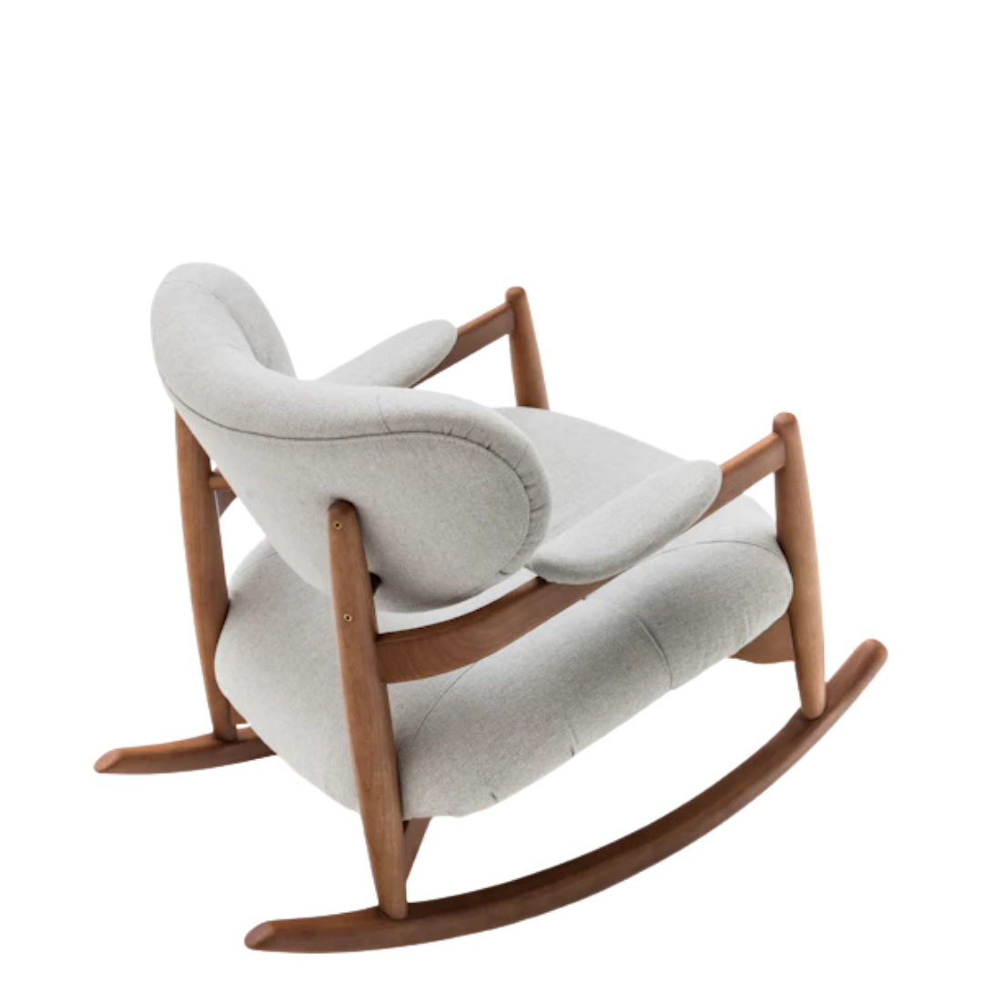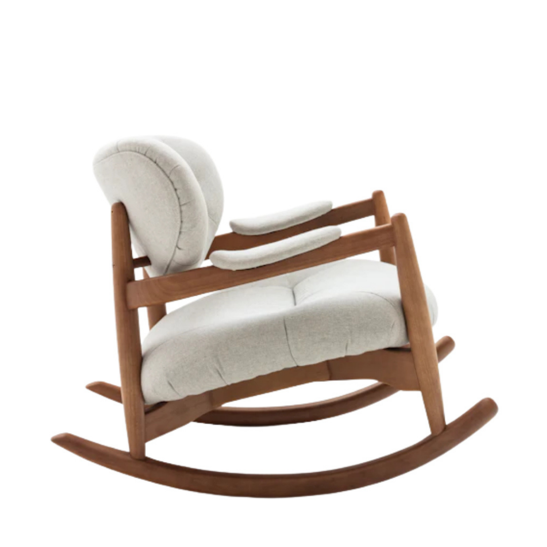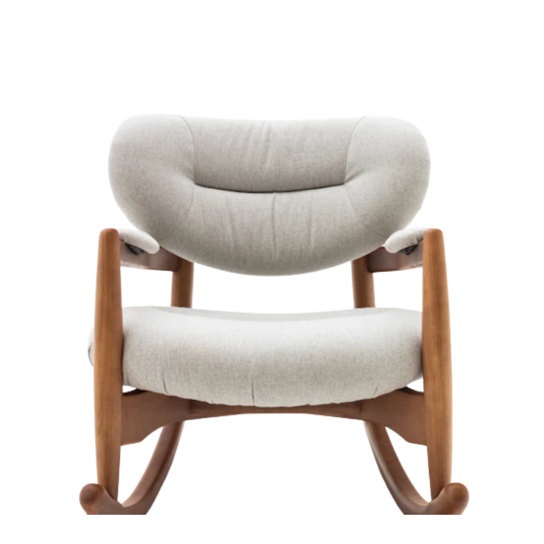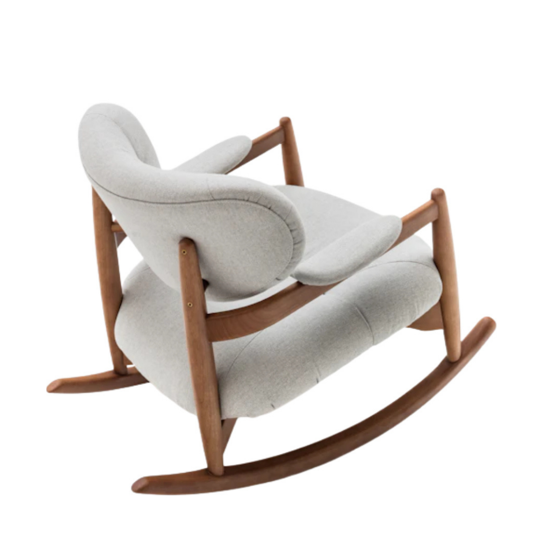Estrutura: Madeira certificada Acabamento: Latão maciço Tapeçaria: Couro natural ou tecido Assento: Curvo estofado Encosto: Curvo estofado Detalhe: Movimento suave, apoio de braço estofado Design: Ergonômico, funcional, relaxante