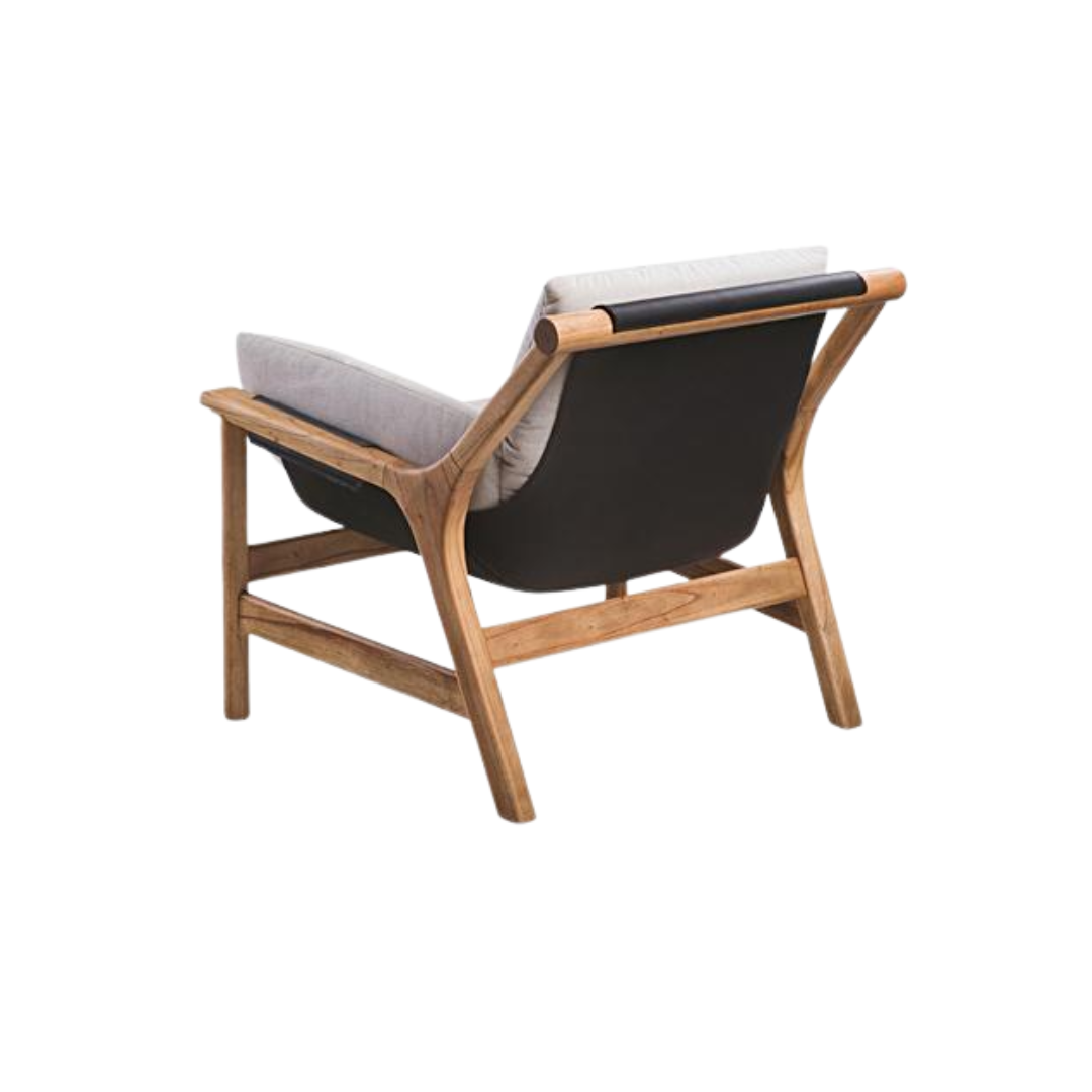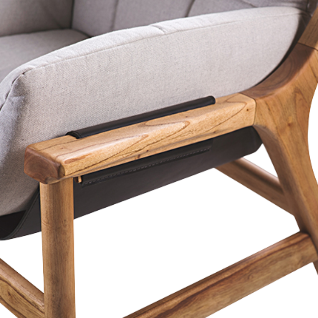A poltrona Areia se destaca pelo conforto e pela proposta descontraída, com concha de couro suspensa que remete ao balanço de uma rede. Sua estrutura de formas orgânicas e linhas arredondadas confere suavidade ao desenho, enquanto o cilindro de madeira no topo do espaldar arremata a peça e reforça sua identidade.