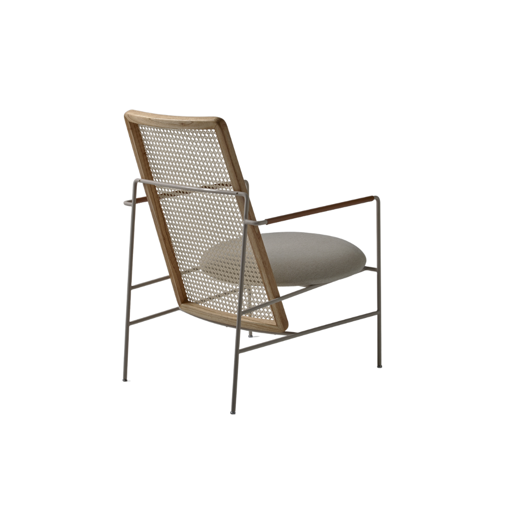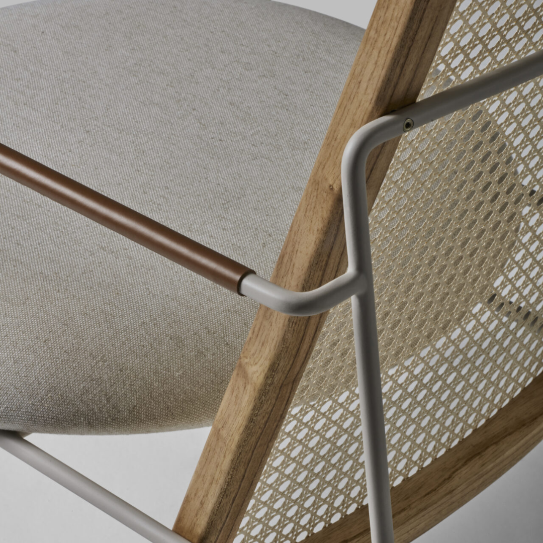 A poltrona Maria é uma peça assinada por Giacomo Tomazzi, batizada em homenagem a sua mãe e inspirada na estética modernista. Seu desenho combina estrutura tubular em aço, madeira e palhinha, criando uma composição leve e expressiva. O detalhe em couro nos braços e o encosto em palhinha inserido em moldura de madeira maciça reforçam o cuidado construtivo da peça, acompanhados pelo assento de formato redondo. Indicada para áreas sociais, como salas de estar, varandas e áreas gourmet, foi pensada para tornar os encontros mais confortáveis e acolhedores.