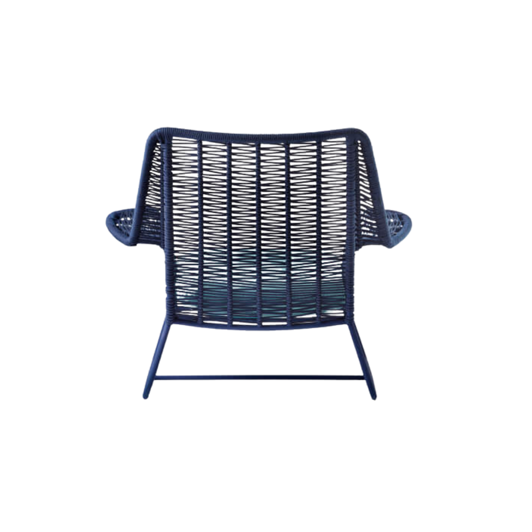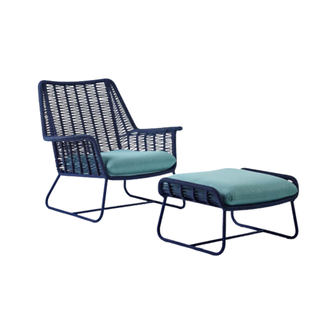 A poltrona Yara homenageia Yemanjá por meio de formas sinuosas e do trançado em corda náutica. Com estrutura em alumínio e acabamento em pintura eletrostática, alia leveza e resistência. Acompanha banco de apoio para os pés, reforçando a proposta de conforto e relaxamento. Versátil, adapta-se a varandas, salas de estar e áreas de lazer.