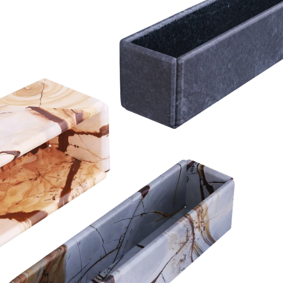 Estrutura: Mármore maciço Acabamento: Levigado Detalhe: Fixação invisível, texturas naturais Design: Funcional, escultural, sofisticado, artesanal