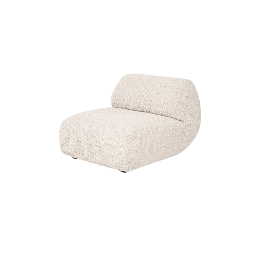 Módulo de sofá/Poltrona estofada com estrutura em madeira, precintas elásticas, espuma hipersoft e revestimento WE–KNIT® (70% PET reciclado + 30% elastano). Pés em madeira com pintura preto fosco e acabamento emborrachado no seu inferior para evitar que os módulos deslizem no chão.