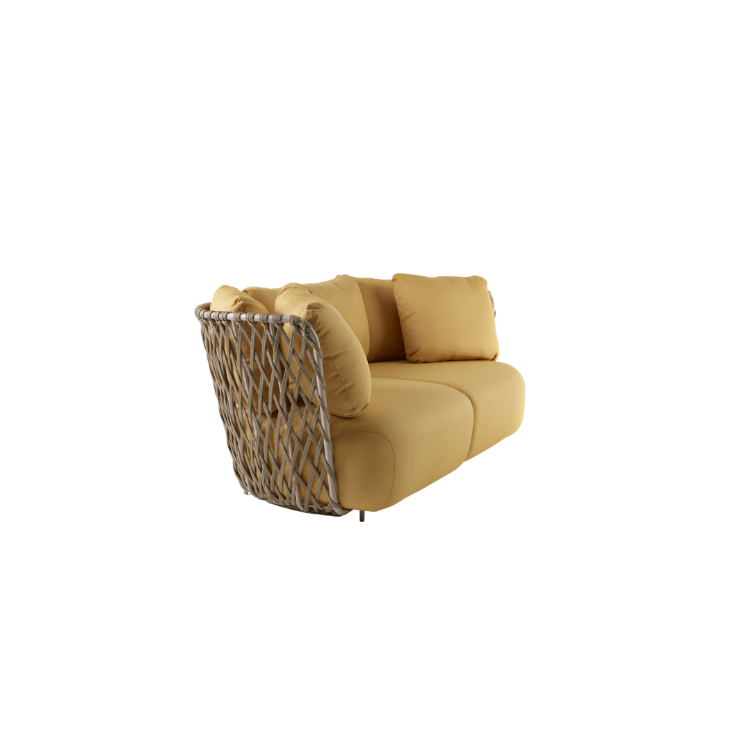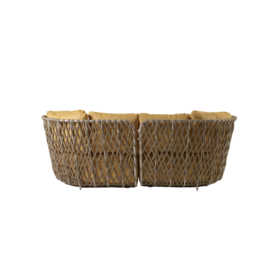 O sofá Seixo foi pensado para momentos de descanso, com desenho inspirado nas formas naturais dos seixos. A estrutura em alumínio recebe trançado em corda náutica no padrão muxarabi e sustenta almofadas generosas em tecido, reforçando o conforto. Modular, pode ser combinado a pufes de diferentes formatos, que também podem funcionar como mesas de apoio, ampliando a versatilidade da peça.